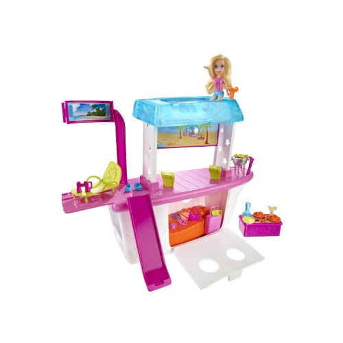 Polly Pocket Party Boat Adventure: Polly and her friends are ready for fun and adventure on the high seas. Polly has a cool party boat featuring a pool, a slide, day to night transformation (buffet area transforms to disco/DJ station), flat screen TV, a below deck bedroom and an area to BBQ, everything needed for fun in the sun or under the stars. Includes one Polly doll, 20+ accessory pieces and Party Boat.